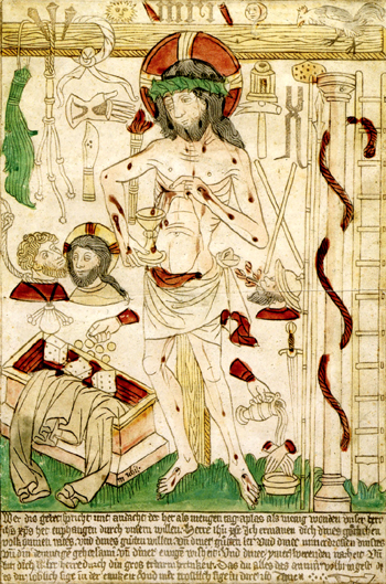 ‘그림 1’의 왼쪽 아래에는 그리스도께서 겟세마니 동산에서 괴로워하시며 기도하신 일을 나타내는 상징들 중 하나인 성작이 있다. 흔히 ‘고통의 십자가’라고도 불리는 이 성작은 삽화들에는 종종 귀한 보석으로 장식된 황금잔과 잔 위에 서 있는 붉은색 십자가로 표현되어 있다. 이는 그리스도께서 겟세마니 동산에서 극한의 근심과 번민으로 흘리신 피땀을 나타낸다. 그 옆에는 배신의 상징인 등불과 횃불이 있다. 이것들은 배신자 유다의 안내를 받아서 로마 군인들과 성전 경비병들의 무리가 등불과 횃불을 들고, 또한 무기를 들고 그리스도를 잡으러 온 것을 가리킨다(요한 8,3 참조). 칼 또는 막대기가 X자 모양으로 교차되어 묘사되면 배신을 나타내기도 하지만, 이 그림에서 칼은 아마도 대사제의 종인 말코스의 귀를 자르는 데 사용된 베드로의 것일 터다. 칼과 더불어 잘린 귀는 종종 겟세마니 동산에서 그리스도께서 악의 무리에게 잡히신 것을 나타낸다. 그림의 중앙에는 그리스도께서 신문을 받으시고 사형 선고를 받으신 것을 가리키는 기둥이 있다. 이것은 또한 본시오 빌라도의 명에 따라 그리스도께서 기둥에 묶이신 가운데 매질을 당하신 것을 연상시킨다. 기둥 꼭대기에는 베로니카의 수건이 있는데, 이는 힘겹게 십자가의 길을 가시는 그리스도께 조금이나마 힘이 되어 드리고자 베로니카가 내어 드린 수건에 그리스도께서 당신의 얼굴을 새겨 주셨다는 일화와 관련된다. 기둥의 왼쪽에는 채찍(더러는 채찍 두 개가 X자 모양으로 교차되어 나타나기도 한다)이 있는데, 이는 그리스도께서 매질을 당하신 것을 상기시킨다. 기둥의 오른쪽에는 악인의 무리가 주님을 조롱하고 폭행할 때 손에 들었던 몽둥이 또는 갈대가 있는데, 이는 주님께서 조롱을 받으시고 매질을 당하신 것을 가리킨다. 종종 침을 뱉는 얼굴이 등장하기도 하는데, 이는 형 집행인들의 짐승 같은 행위를 나타낸다. 그리고 한 줄로 이어져 있는 은돈 서른 닢은 유다의 배신을 나타낸다. 오른쪽 아래에 있는 물병은 빌라도가 손을 물에 씻은 것을 가리킨다. 그리고 물병 옆에는 잘린 손이 있다. 주님의 수난 장면을 묘사하는 데는 손이 많이 사용되었다. 중세기의 화가들은 주님께서 십자가에 못 박히신 장면을 표현할 때 화폭의 배경 여기저기에 이와 같은 모양의 잘린 손들을 배치했다. 오늘날의 사람들에게는 이상하게 보일 수도 있지만, 중세기 그리스도인들의 상상력은 그것들이 뜻하는 바를 어렵지 않게 이해했다. 예를 들자면, 그리스도를 고통스럽게 한 손들이 적지 않았다. 누군가는 주먹을 움켜쥐고 주님을 때렸고, 또 누군가는 주님을 향해 손가락질하며 조롱했다. 그런가 하면 베드로의 손은 칼을 뽑아 말코스의 귀를 잘랐고, 배신자 유다의 손은 대사제의 손에서 은돈 서른 닢을 받았다. 이런 장면에서는 종종 주님께서 피를 흘리시는 일에 자신은 아무런 관련이 없다며 대야의 물에 씻는 빌라도의 손도 등장한다. 더러는 빌라도가 손에 묻은 물기를 닦기 위해 사용한 흰 수건도 등장한다.
